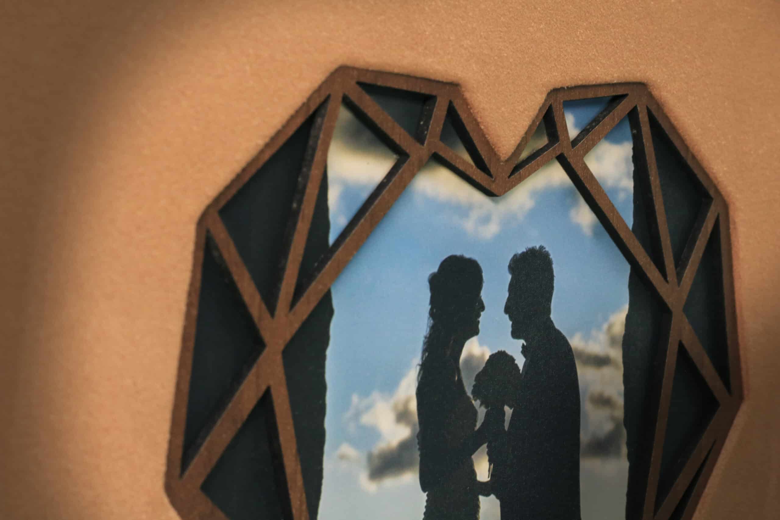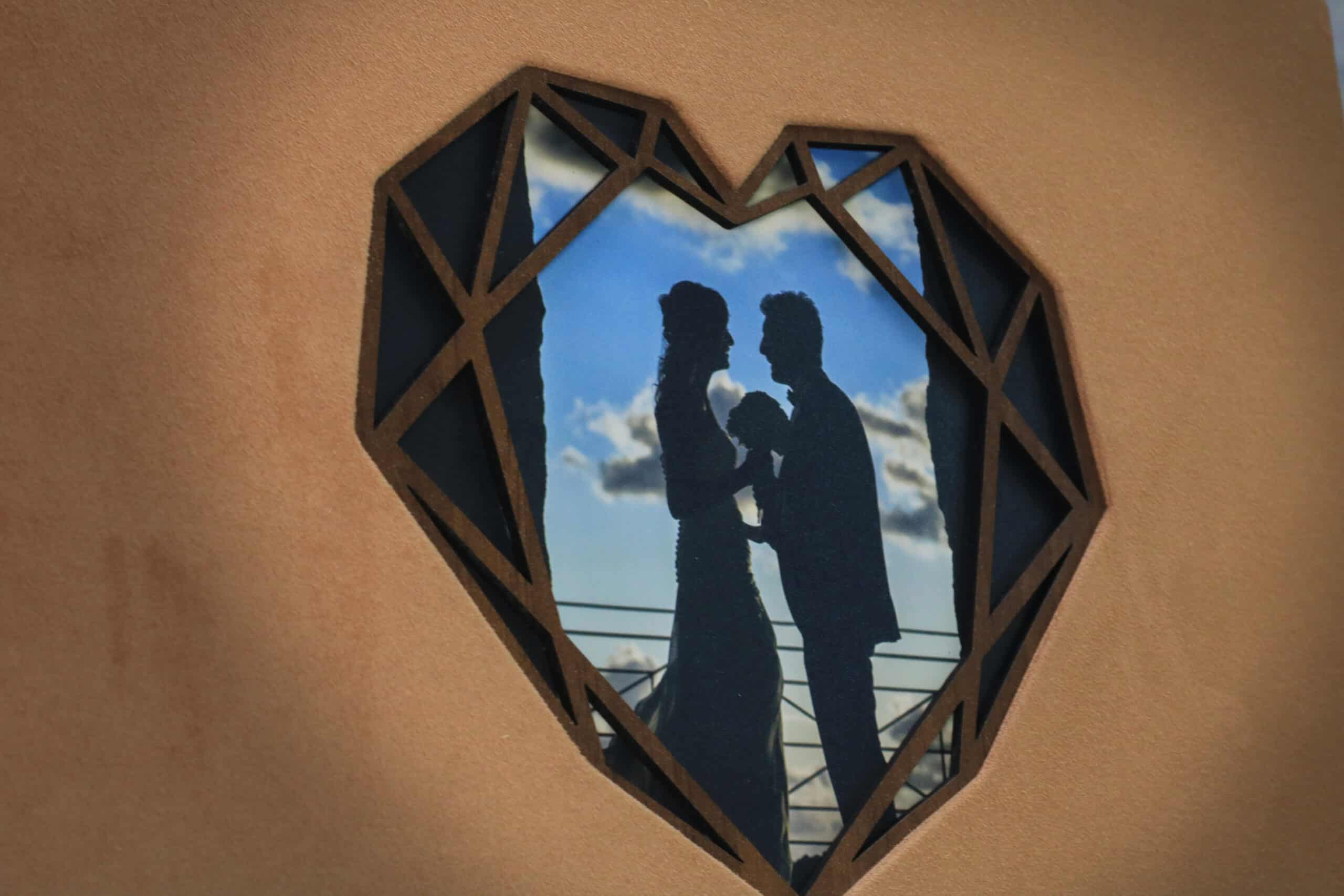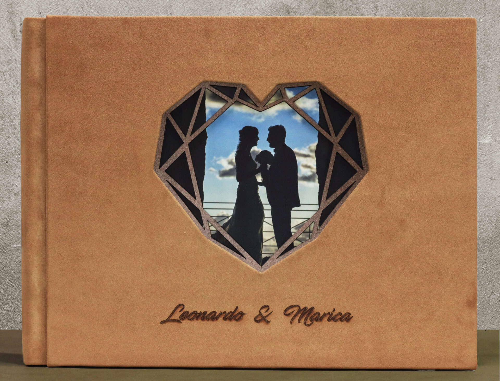 Copertina in alcantara, inserto in legno con foto e personalizzazione a laser.