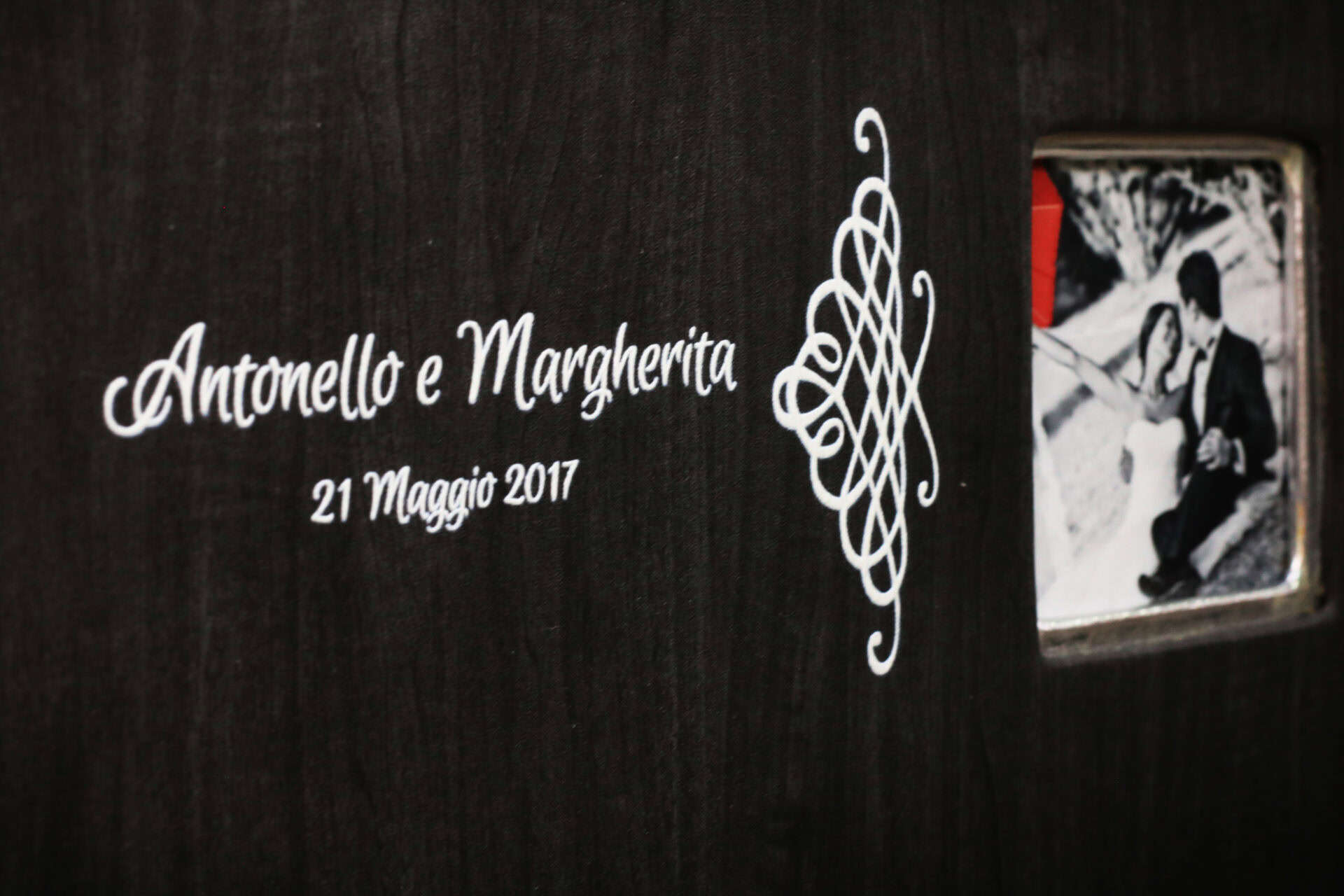 Copertina in acero, con frame fotografico, doppio pannello in ecopelle con dettaglio argento, testo in rilievo tramite stampa diretta uv.