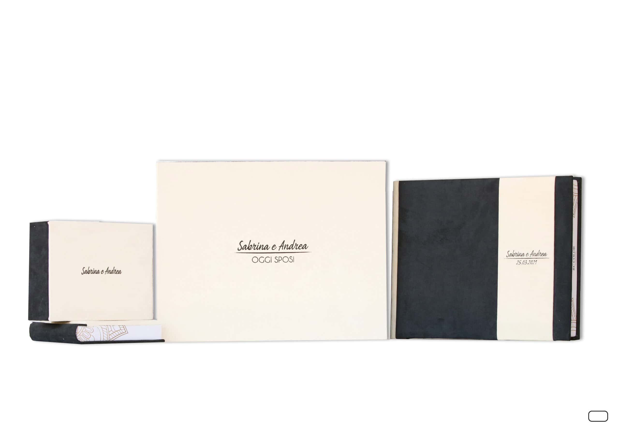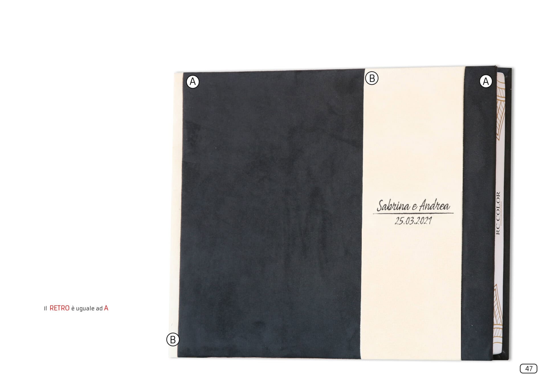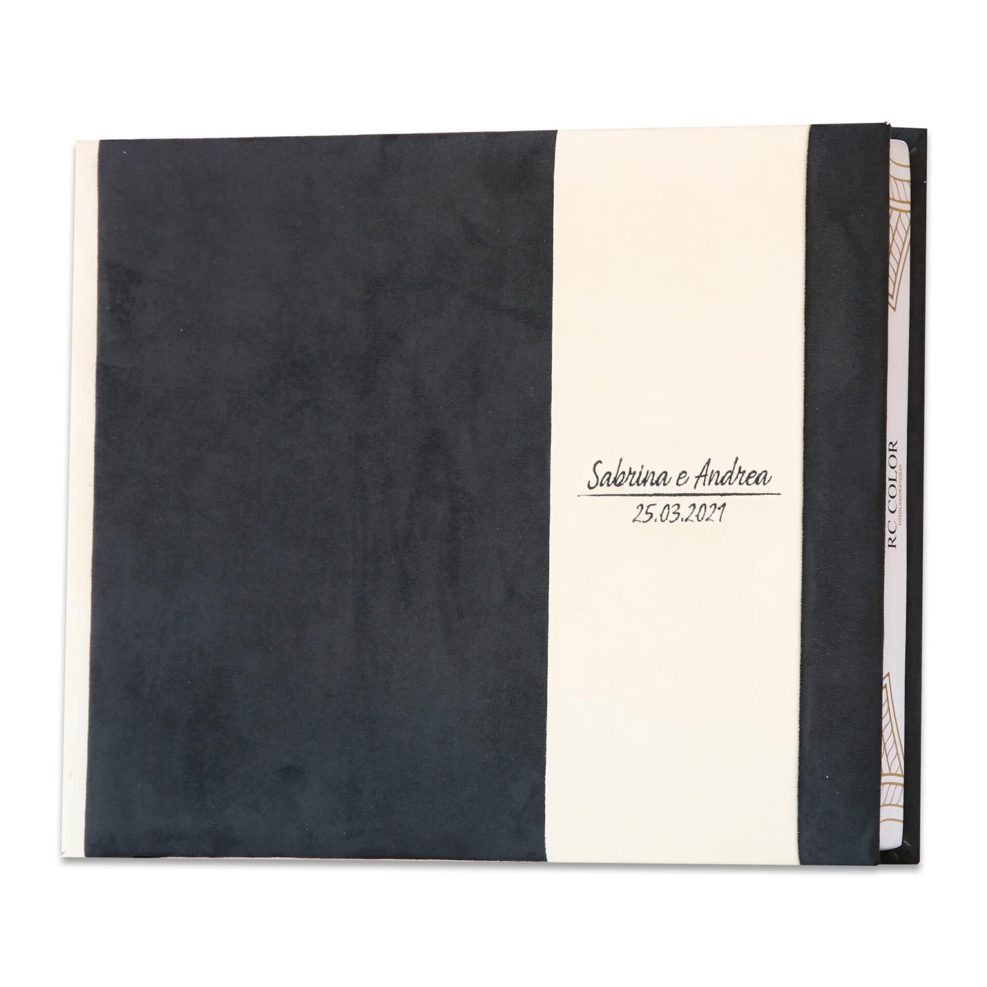 Album in camoscio,  caratterizzato da una fascia in tessuto contrastante, sulla quale viene applicato il ricamo personalizzato.