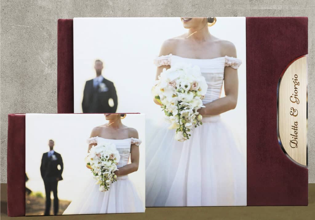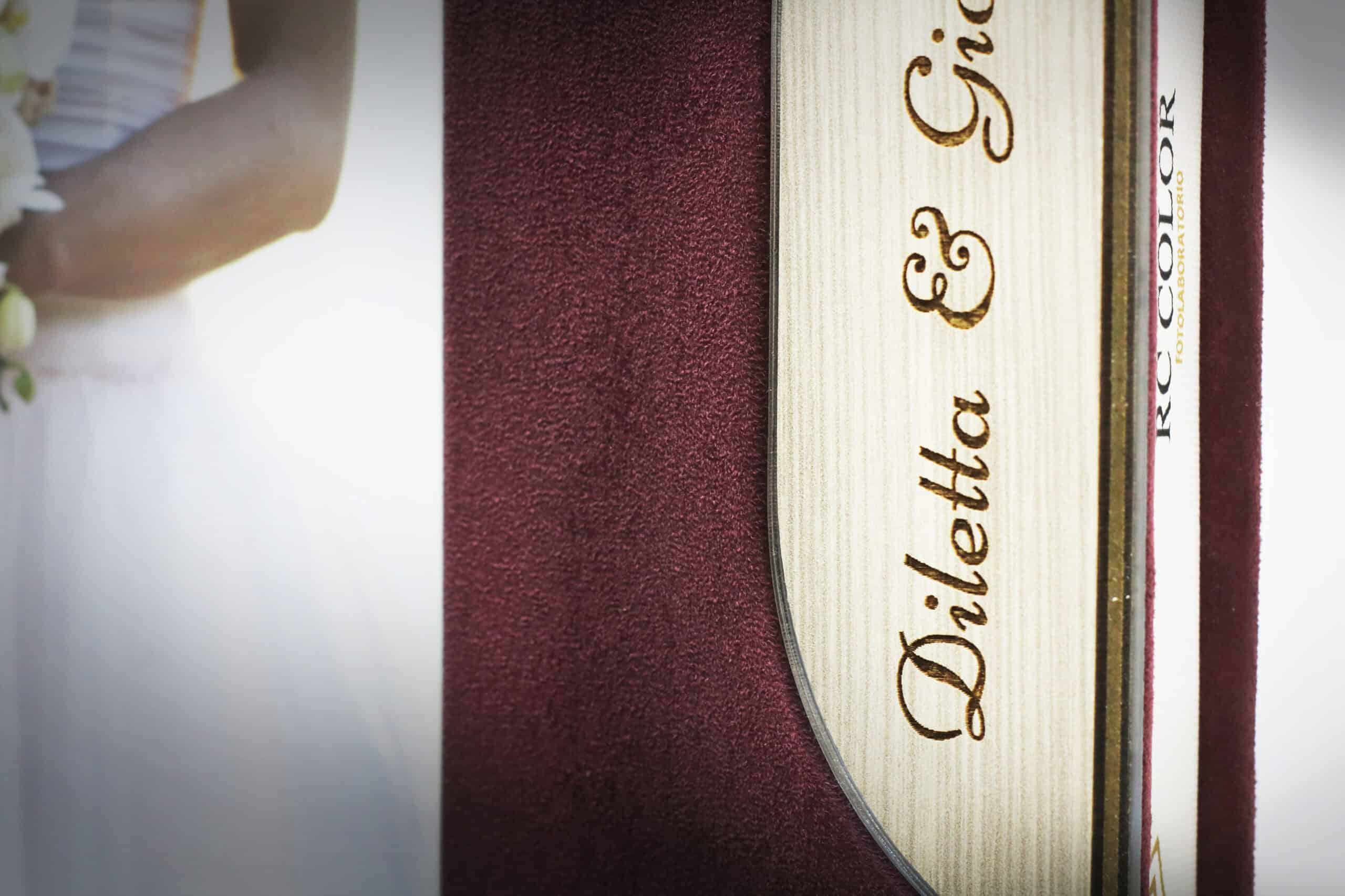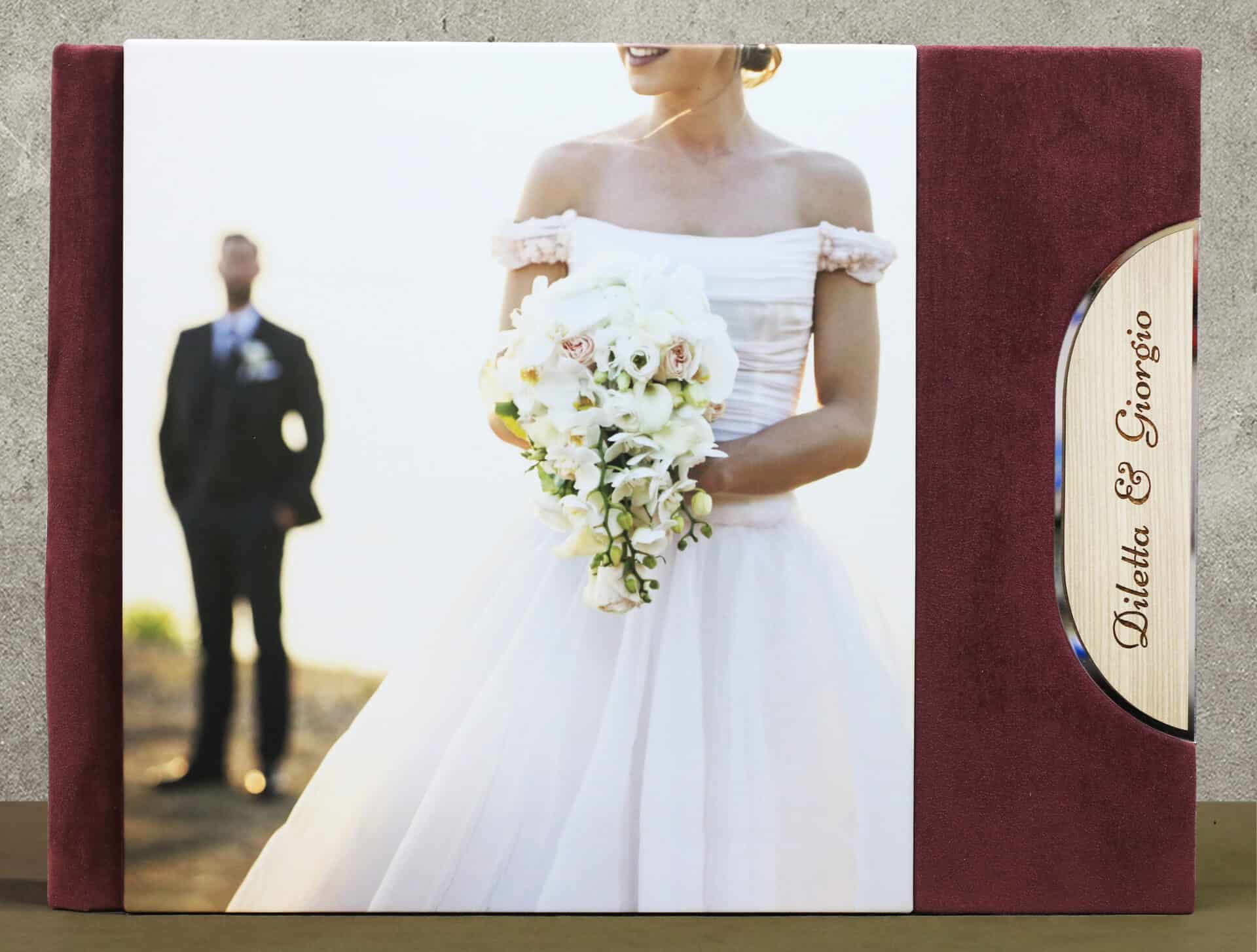 Copertina foto specchio, argento-legno con incisione+camoscio